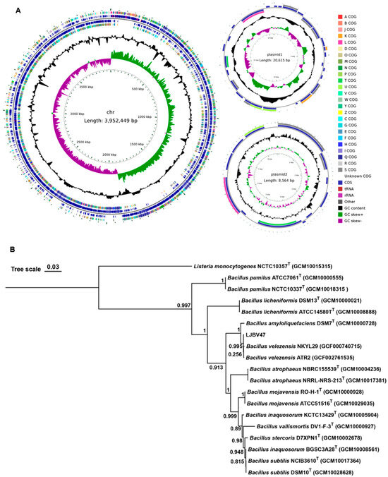 LJBV047 was identified as Bacillus velezensis. (A) Genomic circle diagram of LJBA047. LJBV047 contains a circular chromosome and two plasmids. From the innermost to the outermost of the chromosome, the 1st circle represents the scale marks of the genome, the 2nd circle represents the GC skew (green, positive skew; purple, negative skew), and the 3rd circle represents the G + C content. The 4th and 7th circles indicate reverse and forward COG annotated coding sequences, respectively. The 5th and 6th circles represent reverse and forward CDSs, respectively. Very short features were enlarged to enhance visibility. Clustered genes, such as several rRNA genes, may appear as one line due to space limitations. (B) A phylogenetic tree of LJBV047 was constructed based on genomic sequences. The type strain Listeria monocytogenes NCTC10357T (GCM10015315) was used as the outgroup. The phylogenetic tree was constructed using the Maximum Likelihood (ML) method. The robustness for individual branches was estimated by bootstrapping with 1000 replications. ‘T’ indicates type strains. The scale bar indicates 0.03 nucleotide substitutions per site.