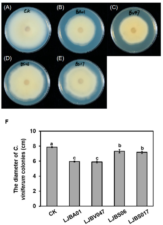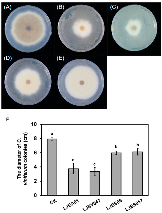 The fermentation filtrates of LJBA01 and LJBV047 inhibit the growth of C. viniferum ‘82A11’. C. viniferum ‘82A11’ was inoculated on PDA medium containing 10% (v/v) fermentation filtrates from LJBA01 or LJBV047. Phenotypic observations (A–E) and measurements of colony diameter (F) were recorded after 6 days. One-way ANOVA was used for multiple comparisons (p < 0.05). Different letters indicate statistically significant differences. Each treatment had three biological replicates.
