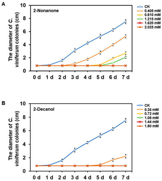 To assess the antimicrobial activity of selected differential volatile compounds, filter paper discs were placed in Petri dishes and loaded with 10, 20, 30, 40, or 50 μL of pure volatile compounds (2-nonanone and 2-decanol). The corresponding concentrations (pure compound concentration/sealed chamber volume) of 2-nonanone were 0.405, 0.810, 1.215, 1.620, and 2.025 mM, respectively; the corresponding concentrations of 2-decanol were 0.36, 0.72, 1.08, 1.44, and 1.80 mM, respectively. An 8 mm mycelial plug of C. viniferum ‘82A11’ was placed at the center of the PDA plate. Using the inverted plate method, two Petri dishes were sealed together with parafilm. Sterile water-treated plates served as the control. All plates were incubated at 30 °C in a constant-temperature chamber, and the colony diameter of C. viniferum ‘82A11’ was measured every 24 h over a 7-day period.