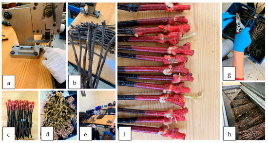 Preparation of different rootstock/scion combinations for grafting, grafting process, and preparation for planting after callusing: (a) Grafting process using the omega grafting machine. (b) General appearance of grafted grapevine saplings before paraffin coating. (c) Appearance of grafted grapevine saplings after callusing. (d) Root development of grafted grapevine saplings before planting. (e) General appearance of the grafting room. (f) Callus development in grafted grapevine saplings. (g) Preparation of cuttings for the grafting process. (h) Thermotherapy application.