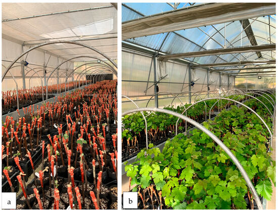 The research greenhouse has a northeast–southwest orientation, covers approximately 200 m2, features a bow-shaped polycarbonate roof, and is equipped with 55% shade cloth, fan heaters, a fan and pad system, and ventilation. Inside the greenhouse, rooting tables measure about 5 m in length, 1.20 m in width, 80 cm in height, and 20 cm in depth. Before planting, the grafted grapevine saplings were given a quick-dip treatment (2 s) with 2000 ppm IBA (Indole Butyric Acid) to promote rooting. They were then planted in 11 × 11 × 22 cm polyethylene pots filled with a sterile 1:1 (v/v) peat mixture. For each rootstock × variety combination, three replications of three grafted saplings each were established (Figure 2). During the growing period, the saplings were irrigated regularly with a nutrient solution recommended by Ollat et al. [42], containing Ca(NO3)2·4H2O (2.5 mM), KH2PO4 (1.0 mM), KNO3 (2.5 mM), MgSO4·7H2O (1.0 mM), Na2MoO4 (0.013 µM), ZnSO4·7H2O (2.40 µM), CuSO4 (0.5 µM), MnCl2·4H2O (9.2 µM), H3BO3 (46.4 µM), and NaFe(III)-EDTA (45 µM). The solution pH was adjusted to 6.5, and irrigation was applied to achieve a 30% drainage ratio. The growing environment was maintained at 25 ± 5 °C with 60–70% relative humidity under natural day length, supported by electric heaters and the fan and pad system. Approximately eight weeks after planting (July), once sufficient root and shoot growth had developed, measurements were taken to assess the performance and quality characteristics of the grafted grapevine saplings produced from different rootstock × variety combinations [43].