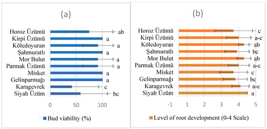 (a) The effect of the cultivar factor on bud viability in grapevines. (b) The effect of the cultivar factor on root development level in grapevines. According to Duncan’s multiple range test, means followed by different lowercase letters differ significantly at the 5% level based on the Rootstock × Cultivar interaction.
