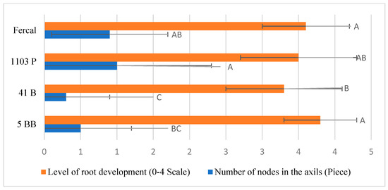 The effect of the rootstock factor on root development level and the number of nodes in the axils in grapevines. According to Duncan’s multiple range test, means followed by different uppercase letters differ significantly at the 5% level based on the Rootstock × Cultivar interaction.