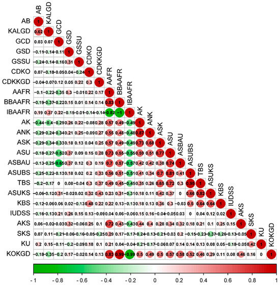 Pearson correlation analysis explaining the relationships between the characteristics examined during the grafting and grafted grapevine sapling stages. AB, grafting success; KALGD, callus development level; GCD, bud viability; GSD, bud sprouting status; GSSU, shoot length from the bud; CDKO, root formation at the base of the cutting; CDKKGD, callus development level at the base of the cutting; AAFR, grafted sapling; BBAAFR, first-order grafted sapling; IBAAFR, second-order grafted sapling; AK, rootstock thickness; ANK, graft union thickness; ASK, grafted shoot thickness; ASU, grafted shoot length; ASBAU, inter-node length on the grafted shoot; ASUBS, bud number on the grafted shoot; TBS, total bud number; ASUKS, bud number on the grafted shoot; KBS, bud number on the cutting; IUDSS, secondary–tertiary basal shoot number; AKS, main root number; SKS, secondary root number; KU, root length; KOKGD, root development level.