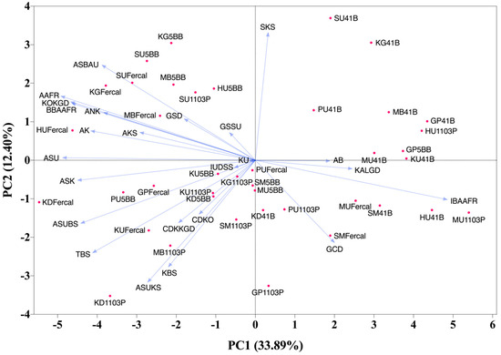 Principal Component Analysis (PCA) visualizing the relationships between different rootstock/cultivar combinations and the examined traits. SU, Siyah Üzüm; KG, Karagevrek; GP, Gelinparmağı; MU, Misket Üzümü; PU, Parmak Üzümü; MB, Mor Bulut; SM: Şahmuratlı; KD, Köledoyuran; KU, Kirpi Üzümü; HU, Horoz Üzümü; AB, grafting success; KALGD, callus development level; GCD, bud viability; GSD, bud sprouting status; GSSU, shoot length from the bud; CDKO, root formation at the base of the cutting; CDKKGD, callus development level at the base of the cutting; AAFR, grafted sapling; BBAAFR, first-order grafted sapling; IBAAFR, second-order grafted sapling; AK, rootstock thickness; ANK, grafting point thickness; ASK, grafted shoot thickness; ASU, grafted shoot length; ASBAU, inter-node length on the grafted shoot; ASUBS, bud number on the grafted shoot; TBS, total bud number; ASUKS, bud number on the grafted shoot’s axils; KBS, node number on the rootstock; IUDSS, secondary–tertiary basal shoot number; AKS, main root number; SKS, secondary root number; KU, root length; KOKGD, root development level.