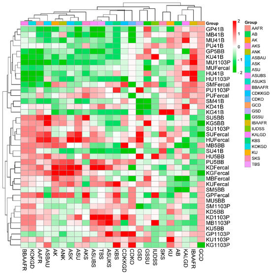 Heatmap analysis visualizing the effects of different rootstock/cultivar combinations on the traits examined during the grafting and grafted grapevine sapling stages. SU, Siyah Üzüm; KG, Karagevrek; GP, Gelinparmağı; MU, Misket Üzümü; PU, Parmak Üzümü; MB, Mor Bulut; SM, Şahmuratlı; KD, Köledoyuran; KU, Kirpi Üzümü; HU, Horoz Üzümü; AB, grafting success; KALGD, callus development level; GCD, bud viability; GSD, bud sprouting status; GSSU, shoot length from the bud; CDKO, root formation at the base of the cutting; CDKKGD, callus development level at the base of the cutting; AAFR, grafted sapling; BBAAFR, first-order grafted sapling; IBAAFR, second-order grafted sapling; AK, rootstock thickness; ANK, grafting point thickness; ASK, grafted shoot thickness; ASU, grafted shoot length; ASBAU, inter-node length on the grafted shoot; ASUBS, bud number on the grafted shoot; TBS, total bud number; ASUKS, bud number on the grafted shoot’s axils; KBS, node number on the rootstock; IUDSS, secondary–tertiary basal shoot number; AKS, main root number; SKS, secondary root number; KU, root length; KOKGD, root development level.