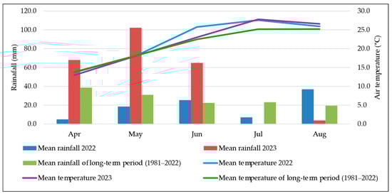 Mean monthly rainfall and temperature during the field experiment (May 2022–August 2023), in comparison with the long-term averages (1981–2022).