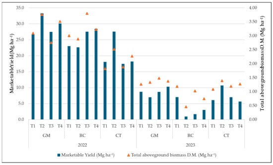Overall, GM treatments showed a marketable yield about 35% higher than the average of the RC and CT treatments, which did not differ significantly between them. The GM treatments also produced the highest aboveground biomass, followed by RC and CT treatments, with reductions of 12.1 and 27.6%, respectively.
