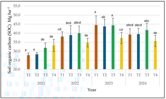 The post hoc statistical analysis results, indicated by the letters in Figure 3, showed significant differences in SOC levels in the treatments and years. In particular, some treatments presented stronger effects in specific years. Notably, treatment T4 consistently reached lower SOC levels across all years compared to T1, T2, and T3. However, the differences among the treatments were reduced over time, and this behavior is clear, especially in 2024, suggesting a stabilization of the SOC accumulation effect.