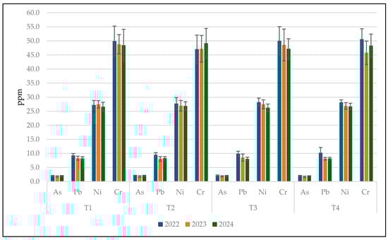 The ANOVA results showed that, for As, there was no significant effect for fertilizer (0.228), cover crop (0.495), year (0.225), and their interactions. This suggests no significant differences between treatments. For Pb, the year was highly significant (p-value < 0.0001), indicating that the Pb concentration changed significantly between years, with an increase in 2024. Fertilizer and cover crop were not significant, so there were no differences between treatments or covers in 2024 or in previous years. For Ni, the year was highly significant (p < 0.0001), indicating that its concentration differed significantly between years. Cr showed a significant effect for cover crop (p < 0.05), indicating that the introduction of cover in crop rotation influenced the Cr concentration. For this element, the year was not significant, so there were no significant differences between years.