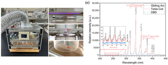 Atmospheric non-thermal plasma devices. (a) The plasma device, (b) dielectric barrier discharge (DBD) plasma, (c) Tesla coil (TC) plasma, (d) gliding arc (GA) plasma and (e) the optical emission spectra of the three plasma devices, GA, TC and DBD, in the range from 200 to 450 nm. The red arrows indicate the generated plasma.