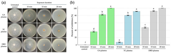 GA and DBD plasma treatments completely inhibited mycelial growth after exposure for 20 min, but for TC plasma, exposure for 20 min could not completely inhibit mycelial growth and there is a need to prolong the exposure period for complete inhibition. This result is consistent with a previous study [29], which reported that TC plasma exhibited the lowest antifungal efficacy against Cercospora lactucae-sativae.