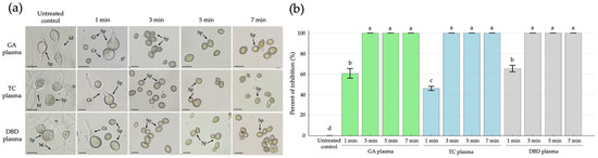 The effects of atmospheric non-thermal gliding arc (GA), Tesla coil (TC) and dielectric barrier discharge (DBD) plasmas on inhibition of sporangiospore germination of Rhizopus stolonifer after 1, 3, 5 or 7 min exposure to each plasma, observed at 24 h after incubation. (a) Sporangiospore germination observed by light microscopy. (b) Percentage inhibition of sporangiospore germination. Sp = sporangiospores; Gt = germ tube; M = mycelia. The scale bar is 10 µM. Error bars represent standard error of means. Means marked with different letters are significantly different at p < 0.05, using the LSD test.