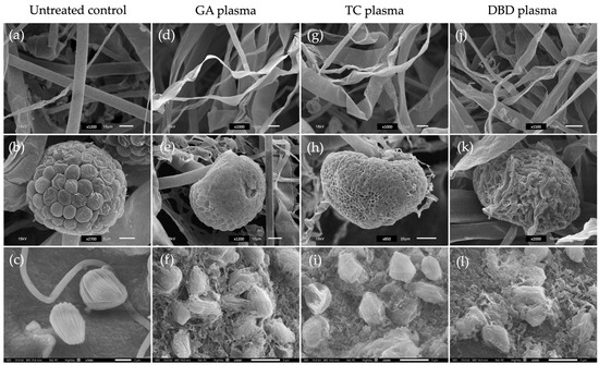 For sporangia, the untreated control sample revealed well-organised and intact surfaces (Figure 4b). NTP treatments led to significant morphological changes. Exposure to GA and TC plasmas caused a moderately wrinkled and collapsed surface (Figure 4e,h). The DBD plasma caused the most severe damage, with the surface appearing highly deformed and ruptured (Figure 4k). In the case of sporangiospores, the untreated control presented intact, ovoid sporangiospores with smooth surfaces (Figure 4c). NTP-treated sporangiospores showed increasing levels of damage. GA and TC exposure lead to surface roughening and minor deformation (Figure 4f,i), whereas DBD plasma resulted in extensive sporangiospore wall disruption and disintegration, likely affecting viability (Figure 4l).