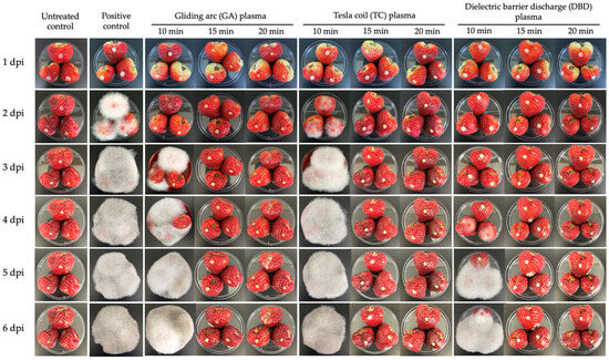 Inhibition of Rhizopus stolonifer pathogenicity on strawberries was assessed after exposure to atmospheric non-thermal gliding arc (GA), Tesla coil (TC) and dielectric barrier discharge (DBD) plasmas for 10, 15 or 20 min. Photographs were taken at 1, 2, 3, 4, 5 and 6 days post-inoculation (dpi). Positive control: untreated, inoculated fruit.