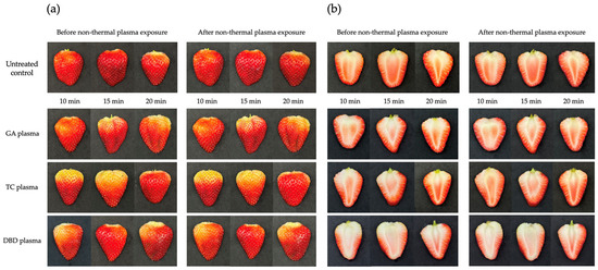 Effects of atmospheric non-thermal gliding arc (GA), Tesla coil (TC) and dielectric barrier discharge (DBD) plasmas on external and internal characteristics of strawberry after exposure for 10, 15 or 20 min. (a) external characteristics of strawberries before (left) and after (right) exposure to NTPs. (b) internal characteristics of strawberries before (left) and after (right) exposure to NTPs.