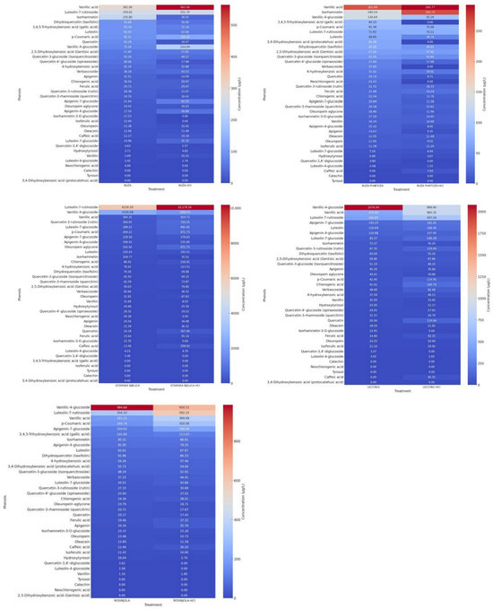 The data presented indicate a significant impact of acidification with HCl on the phenolic profiles of OMWW. The effects can be categorized into three main trends: an increase in phenolic concentrations, a decrease in certain compounds, and the complete absence of specific phenolics following acidification (Figure 1). For instance, HCl treatment increased the concentrations of the most abundant phenolics in OMWW from Buža, Buža puntoža, and Istarska bjelica, while a decrease was observed in OMWW from Leccino and Rosinjola. In some cases, such as in OMWW from Buža puntoža, caffeic acid was not detected in the sample without HCl treatment but was present following HCl treatment. Conversely, quercetin-3,4′-diglucoside was detected without HCl treatment but was absent after HCl treatment.