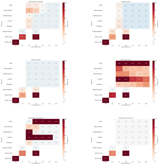 Overall, among the tested fungi, N. parvum proved to be the most resistant species, where only the vanillic acid component and fungicide had an inhibitory effect on fungal mycelial growth (Figure 2). Conversely, Do. iberica was the most susceptible species to all treatments. Inhibitory effects of OMWW on fungal mycelial growth on the seventh day of measurement were observed exclusively for Do. sarmentorum. For D. seriata, all OMWW treatments stimulated mycelial growth. In D. mutila, only the lowest concentration of all OMWWs had an inhibitory effect, whereas higher concentrations exhibited a stimulatory effect across all treatments. A similar pattern was observed for B. dothidea, where lower OMWW concentrations inhibited mycelial growth, while higher concentrations stimulated growth. Vanillic acid was more effective compared to the component hydroxytyrosol, and the fungicide Nativo 75WG also demonstrated high efficacy in inhibiting fungal mycelial growth. Among the OMWW treatments, the most significant effects were observed with OMWW from Leccino, followed by Buža. Considering that the treatments’ effects were more pronounced on the second day of measurement and that most treatments acted fungistatically, the percentage inhibition of fungal mycelial growth by fungi and treatments on the second day was graphically represented.