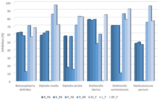 Results of the statistical analysis of the antagonistic activity of microorganisms isolated from OMWWs against phytopathogenic fungi. The graph represents the calculated percentage of inhibition of fungal mycelial growth by microorganisms isolated from OMWWs. Different isolates were tested against six phytopathogenic fungi: Botryosphaeria dothidea, Diplodia mutila, Diplodia seriata, Dothiorella iberica, Dothiorella sarmentorum, and Neofusicoccum parvum. Higher inhibition percentages indicate stronger antagonistic effects.