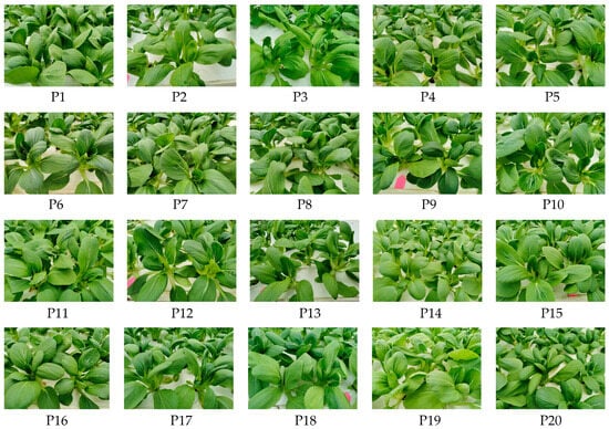 Twenty pakchoi parent materials were provided by the Horticulture Research Institute, Shanghai Academy of Agricultural Sciences, which are represented as P1, P2, …, P20. Cultivation was conducted in a plastic film greenhouse located at the Zhuanghang Experimental Station, Fengxian District, Shanghai (120°23′5.19′′ S; 30°53′21.03′′ W). The seeds were sown into moistened nursery sponges (Beijing Zhongxin Zhiyun Technology Co., Ltd., Beijing, China, 25 mm × 25 mm) and placed under a shade net, which were removed once the cotyledons had fully expanded. Forty-two seedlings (with two fully expanded true leaves) from each cultivar were randomly selected and evenly divided into three groups, each planted on a separate nutrient film technique (NFT) culture bed (Figure 1). The three cultivation beds were constructed with identical structural specifications and maintained under consistent cultivation management protocols. During the experiment, the average greenhouse temperature and relative humidity were 25.1 °C and 77.5%, respectively. The plants were grown under natural sunlight filtered through plastic film with a daily photoperiod of approximately 12 h. The nutrient solution irrigation and pause intervals were set at 10 and 20 min, respectively. The electrical conductivity (EC) and pH of the nutrient solution were maintained at approximately 2 mS·cm−1 and pH 6. The nutrient solution composition is shown in Table 1. All fertilizers used in the experiment were provided by Shanghai Yongtong Ecological Engineering Co., Ltd., Shanghai, China.