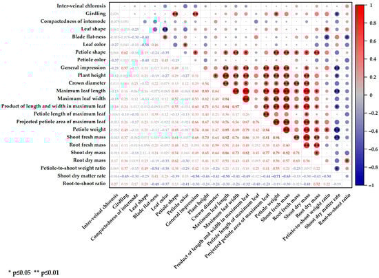 Correlation analysis between commodity characteristics and agronomic traits. The upper right circle represents the correlation between different parameters, and the lower left numbers represent the correlation coefficients, with red being a positive correlation and blue being a negative correlation. “*” indicates a significant correlation at p ≤ 0.05, and “**” indicates a significant correlation at p ≤ 0.01.