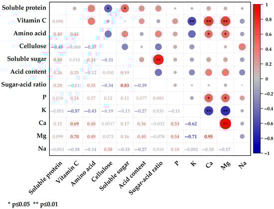 Correlation analysis between nutritional quality traits. The upper right circle represents the correlation between different parameters, and the lower left numbers represent the correlation coefficients, with red being a positive correlation and blue being a negative correlation. “*” indicates a significant correlation at p ≤ 0.05, and “**” indicates a significant correlation at p ≤ 0.01.
