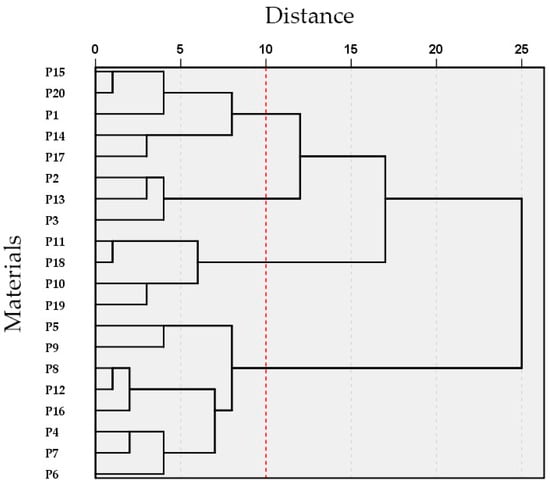 Results of cluster analysis on main agronomic characteristics and nutritional quality of 20 pakchoi parental materials. Classification was performed at a Euclidean distance of 10, as marked by the red line.