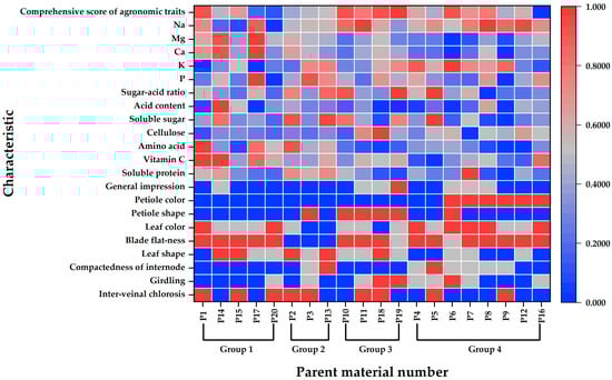 Group 1 comprised five parent materials (P1, P14, P15, P17, and P20), characterized by a high vitamin C content, with an average of 123.86 μg·g−1. These materials exhibited a green or dark green leaf color, white-green petioles, flat leaves, compact internodes, absence of pronounced waist girdling, and flat petioles. Their commercial appearance was generally rated as average. In terms of mineral composition, most materials in this group had relatively high Ca and Mg contents but lower K and Na levels. They also reported elevated levels of vitamin C, amino acids, and titratable acids. Except for P1, the other four materials in this group had relatively low agronomic trait scores.