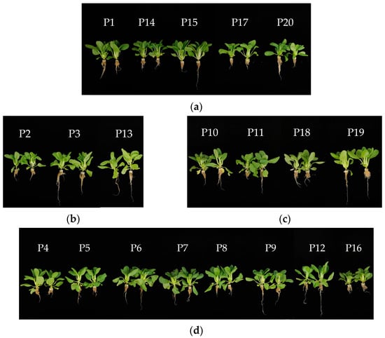 Grouping of 20 pakchoi parental materials according to cluster analysis results: (a), (b), (c), and (d) represent groups 1, 2, 3, and 4, respectively.