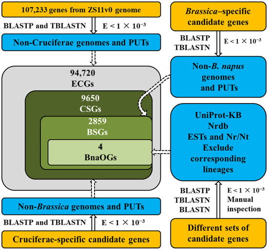 A stringent manual inspection approach integrating transcriptomic and plant genomic sequence data was employed to screen BnaOGs, BSGs, CSGs, and ECGs. Furthermore, 107,233 rapeseed genes were identified and classified from the ZS11v0 genome using BLASTP, TBLASTN, and BLASTN (v2.16.0) (E < 1 × 10−3). The comparative genomic analysis against genomes and PlantGDB-generated unique transcripts (PUTs) revealed candidate BnaOGs, BSGs, CSGs, and ECGs by carefully excluding sequences from corresponding lineages (Figure 1). Moreover, to improve identification accuracy and reduce false positives, candidate BnaOGs, BSGs, and CSGs were manually validated against multiple databases, including UniProt Knowledgebase (UniProt-KB), non-redundant protein database (Nrdb), Expressed Sequence Tag (EST), and Nr/Nt databases. Comprehensive screening identified and classified the gene sets into 4 categories: 4 BnaOGs, 2859 BSGs, 9650 CSGs, and 94,720 ECGs.