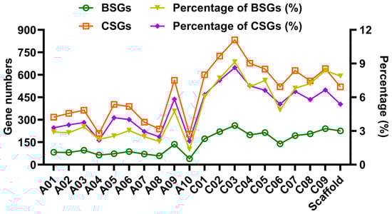 The chromosomal distribution and proportional representation of only BSGs and CSGs were examined, and BnaOGs were excluded due to their limited number (Figure 2). Chromosomal distribution analysis demonstrated that BSGs and CSGs maintained relatively uniform distribution patterns across all 19 chromosomes, with mean proportions of 4.85% and 4.98%, respectively. Furthermore, the comparative analysis indicated variation in gene distribution, with chromosome C03 containing the maximal concentrations of BSGs (9.13%) and CSGs (8.63%), contrasting sharply with the minimal proportions found on chromosome A10 (1.36% and 2.11%, respectively). This distribution pattern suggests that longer chromosomes harbor greater numbers of these OGs. Moreover, unassembled scaffold regions had 225 BSGs (7.87%) and 519 CSGs (5.38%), highlighting that these OGs may reside in structurally complex genomic regions containing repetitive elements or structural variations that challenge chromosome-scale assembly.