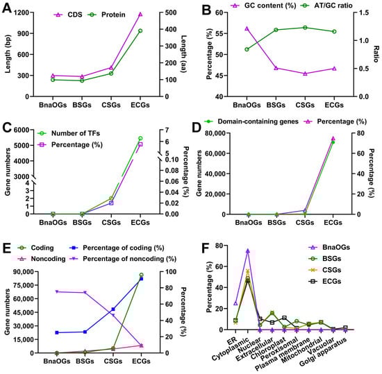 The structural and evolutionary features of different gene categories were systematically characterized through multiple computational analyses, including sequence length distribution, GC content variation, predictive assessments of TFs, domain architecture, coding potential, and subcellular localization. The results indicated that the average CDS and protein lengths of BnaOGs, BSGs, and CSGs were substantially shorter than those of ECGs (Figure 3A). Furthermore, BnaOGs had the highest GC content (56.19%) and lowest AT/GC ratio (0.84), suggesting a strong GC bias (Figure 3B), whereas BSGs (46.80%), CSGs (45.45%), and ECGs (46.67%) indicated relatively balanced GC/AT distributions, with AT/GC ratios exceeding 1. Moreover, CSGs had the most pronounced AT preference (AT/GC ratio = 1.23), followed by BSGs (1.19) and ECGs (1.16). Moreover, TFs analysis revealed significant categorical differences, with ECGs comprising the highest TF numbers (5453) and proportion (5.76%), followed by minimal representation in CSGs (2, 0.02%) and complete absence in both BSGs and BnaOGs (Figure 3C). These patterns suggest strong evolutionary conservation of TF-encoding potential within ECGs and near-complete exclusion from other OG classes.