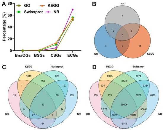 To assess the functional characterization and evolutionary divergence of various gene categories (BnaOGs, BSGs, CSGs, and ECGs), the functional annotation coverage of these gene categories was comprehensively compared across four major databases (GO, KEGG, SwissProt, and NR). Functional annotation analysis revealed a progressive increase in characterization levels across different gene categories (Figure 4A). Furthermore, BnaOGs were not annotated in all four databases, and only 29 BSGs showed minimal functional characterization (1.01%) (Figure 4B). Moreover, 2264 CSGs showed intermediate annotation levels (23.46%) (Figure 4C), while 76,371 ECGs had substantially higher functional assignment rates (80.63%) (Figure 4D), indicating that it was the best-characterized group in this analysis. The exceptional ECGs annotation coverage suggests that these genes represent well-characterized functional elements. The near-zero annotation of BSGs and BnaOGs could indicate non-canonical biological roles or novel functions that are not currently represented in databases. These results may reflect fundamental differences in evolutionary origin and functional importance among these gene categories.