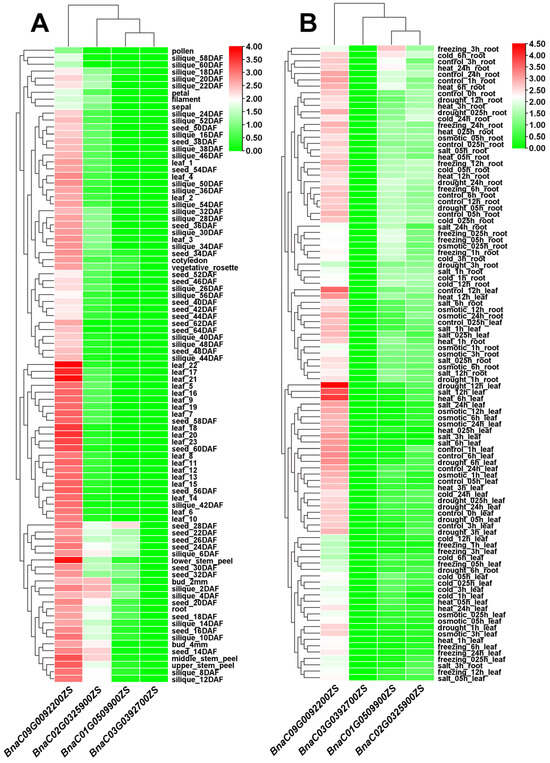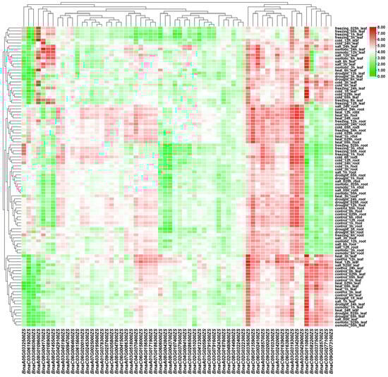 Expression patterns of core BSGs under different stress conditions in rapeseed. Columns represent different BSGs, and rows indicate distinct stresses. FPKM values indicate expression intensity, with a color continuum ranging from green (minimum expression) to red (maximum detected expression). Co-expressed genes and functionally related tissues were clustered based on their expression profile correlations.