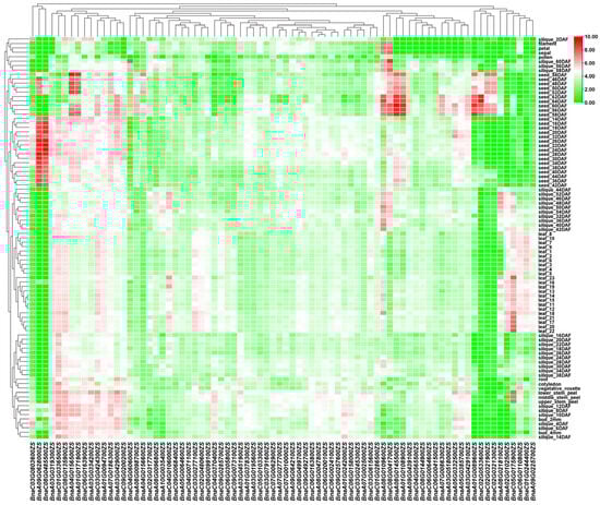 Expression patterns of core BSGs across different rapeseed tissues. The heatmap displays expression patterns of core BSGs across various rapeseed tissues. Columns represent different BSGs, and rows indicate distinct tissue types. Expression levels are shown as FPKM values, with red and green color gradients denoting high and low expression, respectively. Hierarchical clustering analysis grouped genes and tissues with similar expression patterns.