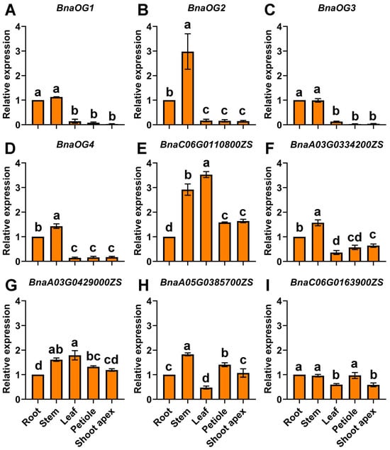 Tissue-specific expression profiles of BnaOGs and core BSGs in rapeseed. Expression patterns of (A–D) BnaOGs and (E–I) core BSGs across various rapeseed tissues. The y-axis represents relative expression levels normalized to reference genes BnaPPR and BnaGDI1. Data are shown as the mean ± SE (three biological replicates). Lowercase letters above bars denote statistically significant differences (one-way ANOVA, p < 0.05).