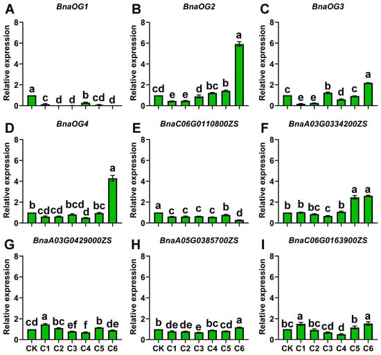 Cold stress-responsive expression patterns of BnaOGs and core BSGs in rapeseed. Dynamic expression changes in (A–D) BnaOGs and (E–I) core BSGs during cold stress exposure. The y-axis represents relative expression levels normalized to the reference genes BnaPPR and BnaGDI1. The x-axis indicates cold stress exposure time. CK represents the untreated control (0 h), while C1-C6 corresponds to 2, 4, 8, 12, 24 h, and 48 h of cold stress treatment, respectively. Data are presented as the mean ± SE (three biological replicates). Lowercase letters above bars indicate statistically significant differences (one-way ANOVA, p < 0.05).