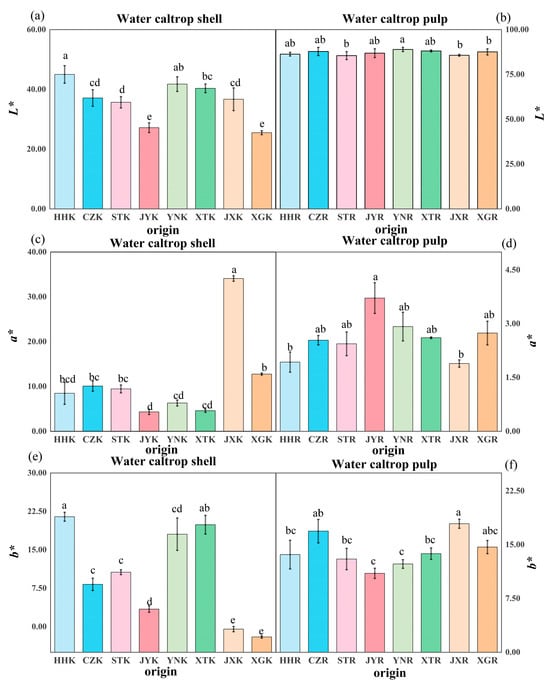 Shell L* values (a), pulp L* values (b), shell a* values (c), pulp a* values (d), shell b* values (e), pulp b* values (f) of different origins of water caltrop. Note: Different letters, e.g., a, b, c, etc., indicate significant differences (p < 0.05) between origins at the same harvesting stage.