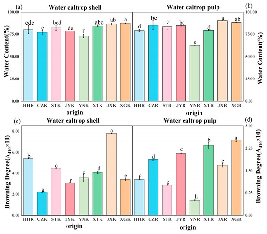 Shell water content (a), pulp water content (b), shell browning (c), and pulp browning (d) of different origins of water caltrops. Note: Different letters, e.g., a, b, c, etc., indicate significant differences (p < 0.05) between origins at the same harvesting stage.