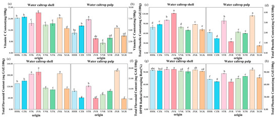 VC of shells (a), VC of pulp (b), total phenols of shells (c), total phenols of pulp (d), total flavonoids of shells (e), total flavonoids of pulp (f), free radical scavenging rate of DPPH in shells (g), and free radical scavenging rate of DPPH in pulp (h) of different origins of water caltrop. Note: Different letters, e.g., a, b, c, etc., indicate significant differences (p < 0.05) between origins at the same harvesting stage.