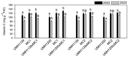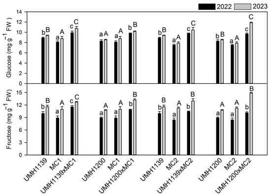 22]. No effect that could be attributed to the introduction of resistance genes was detected with regard to soluble sugars, but it was noted that hybrids consistently outperformed their traditional parents (MC2 and MC1), with an average increase in glucose and fructose of 18% and 22%, respectively, over MC2 and MC1, and variations depending on the hybrid and year.