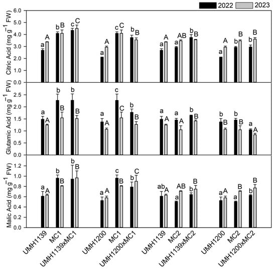 Ty-1 gene, exhibited reductions in all of the three major organic acids (UMH1200×MC1) or the glutamic acid only (UMH1200×MC2). However, in the UMH1200×MC1 hybrid, this decrease did not reach the levels observed in the breeding line, instead presenting an intermediate concentration of the three acids, possibly due to the presence of a single copy of the
