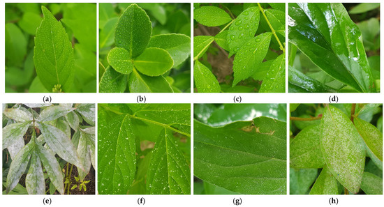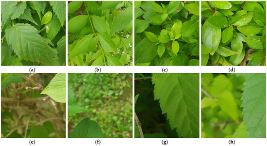 Example plant images from the self-collected dataset [19]. (a–d) Images containing full leaves; (e–h) images with leaf fragments.