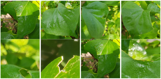 Previous studies have used images with only a single plant leaf [15,16], images with only a single plant [17], and images full of plants and plant leaves with little background [18]. Moreover, in datasets consisting entirely of plants and leaves without a background, many images feature blurred plant regions rather than high-resolution details of the target plant (Figure 1h). Furthermore, in datasets containing a single plant or a plant with only one leaf, most images include more background than plant content, or only a partial leaf is visible (Figure 1e–g). In such cases, classification models struggle to identify the relevant regions for classification, leading to insufficient information for plant image classification and a decline in performance. Additionally, classification accuracy may further deteriorate when plants are covered with moisture, water droplets, or dust (Figure 2) or when a leaf is partially lost (Figure 3).
