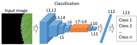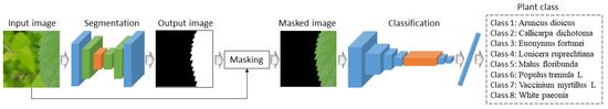 Various systems incorporating cameras and artificial intelligence (AI) algorithms have been developed for the segmentation and classification of plant images. These systems are extensively applied in multiple domains, including crop disease classification and detection [1,2,3], plant disease diagnosis [4], fruit classification [5,6,7,8], and plant classification [9,10,11,12]. For plant recognition using images acquired by camera devices, several approaches exist, including detection algorithms [3], image blur removal techniques [13], hand-crafted algorithms, and methods utilizing image datasets that have been manually processed [14].