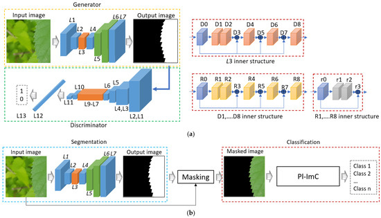 This subsection presents a detailed description of the architecture of Pl-ImS, the proposed segmentation method. Tables S1–S5 (Supplementary Materials) provide the architecture of segmentation networks. The segmentation networks process input and output images of size 1000 × 1000 × 3 (width × height × depth). As shown in Table S1, the segmentation network is composed of a tanh activation layer (tanh), an upsampling layer (up_sampling2d), convolution layers (conv2d), an input layer (input), RDense blocks, and parameters (Params). The sizes of the padding of conv2d_0 to conv2d_3 is 1, while the stride size for conv2d_0 and conv2d_1 is 2, and for the other layers, it is 1. The filter sizes of conv2d_0 to conv2d_3 are all 3, with conv2d_0 and conv2d_1 having 512 filters, while conv2d_2 and conv2d_3 contain 128 and 3 filters, respectively. “#” indicates “number of” in all contents. In Table S2, dense_0 represents a densely connected layer, whereas Table S3 defines res_0 as a residual block. Table S4 specifies that both the padding and stride sizes for conv2d_0 and conv2d_1 are 1. In Table S5, the stride sizes for conv2d_0, conv2d_1, and conv2d_3 are 1, while the other layers have a stride size of 2. The residual block remains consistent, and the padding size, excluding the residual block, is 0. Figure 5 displays the segmentation network, where Figure 5a shows the training phase and Figure 5b shows the testing phase. In Figure 5, L1–L7 correspond to “layer #” in Table S1, while L1–L13 align with Table S5. Additionally, D0–D8, R0–R8, and r0–r3 denote RDense blocks, dense blocks, and residual blocks, as indicated in Tables S2–S4.