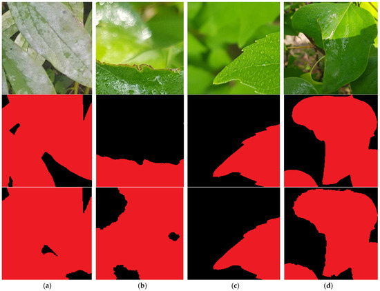 Figure 8 shows the segmentation error and correct segmentation cases generated by the proposed Pl-ImS. In Figure 8a, the input image was covered with dust, which caused the segmentation error. In Figure 8b, the input image was missing some parts of the plant, and the remaining plant parts were blurred, which caused the segmentation error. However, as shown in Figure 8c,d, the proposed Pl-ImS segmented the plant image well even when some parts were removed.