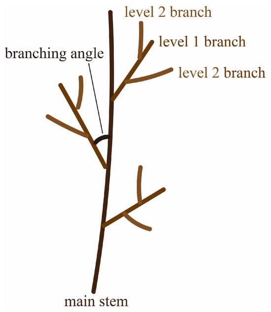 where Nt is the total number of branches in all branch-class levels; Ns is the number of branches at the last branch-class level; and N1 is the number of branches at the first branch-class level. The first-class branches are attached to the main stem, while the secondary class branches are attached to the first branch, and the rest of the branches are attached in the same manner; i.e., branches directly attached to the main stem were considered class 1 branches, and lateral branches attached to class 1 branches were considered level 2 branches (this scheme is clearer in Figure 1).