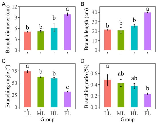 Differences in the branch traits of level 1 branches of Pinus koraiensis under different light intensities: (A) differences in branch diameter, (B) branch length, (C) branching angle, and (D) branching ratio of level 1 branches of Pinus koraiensis under different light intensities. LL, low light; ML, moderate light; HL, high light levels; FL, full light. Different lowercase letters indicate significant differences among different light conditions, with p < 0.05 according to one-way ANOVA and an LSD post hoc test; non-significant results were omitted. Values are means ± SE, with n = 3 biological replicates.