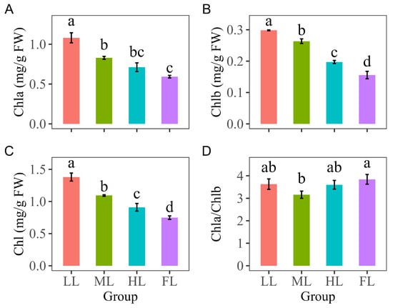 Comparisons of chlorophyll concentrations in Pinus koraiensis needles under different light intensities: (A) chlorophyll a (Chla), (B) chlorophyll b (Chlb), (C) total chlorophyll (Chl), and (D) chlorophyll a/chlorophyll b (Chla/Chlb) concentrations in Pinus koraiensis needles under different light intensities. LL, low light; ML, moderate light; HL, high light levels; FL, full light. Different lowercase letters indicate significant differences among different light conditions, with p < 0.05 according to one-way ANOVA and an LSD post hoc test; non-significant results were omitted. Values are means ± SE, with n = 3 biological replicates.